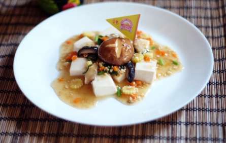 - ตั้งกระทะใส่น้ำมัน เจียวเต้าหู้สับจนเหลือง ใส่เห็ดหอมสด แครอทและข้าวโพดอ่อนลงไปผัดให้เข้ากัน