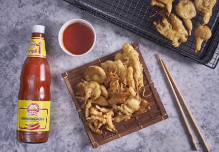 - ตั้งน้ำมันบนความร้อนปานกลาง นำเห็ดลงไปทอดทีละชิ้น ให้สุกและมีสีเหลืองทองจัดใส่จานเสิร์ฟพร้อมซอสพริกสูตรเผ็ดน้อย ตราภูเขาทอง