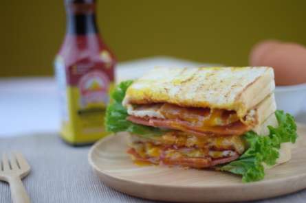 - ทาขนมปังย่างทุกแผ่นด้วยมายองเนสมาโย่ วางผักกาดหอม หอมใหญ่ แฮม และไข่ดาวลง แล้ววางทับด้วยขนมปังแผ่นที่สอง