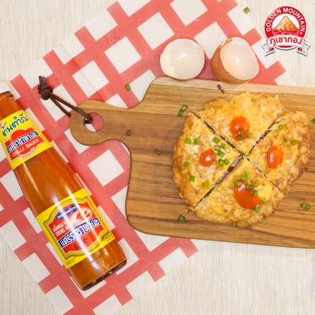 - จากนั้นตักขึ้น แล้วหั่นเป็นชิ้นคล้ายพิซซ่า โรยด้วยต้นหอมซอย เสิร์ฟคู่กับ ซอสพริก ตราภูเขาทอง สูตรเผ็ดน้อย