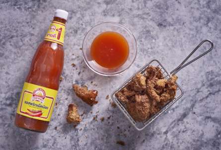 - ตั้งน้ำมันบนความร้อนปานกลาง นำหนังไก่ที่คลุกแป้งแล้วลงทอดให้สุกและกรอบดีจัดใส่จานเสิร์ฟพร้อมซอสพริกสูตรเผ็ดน้อย ตราภูเขาทอง
