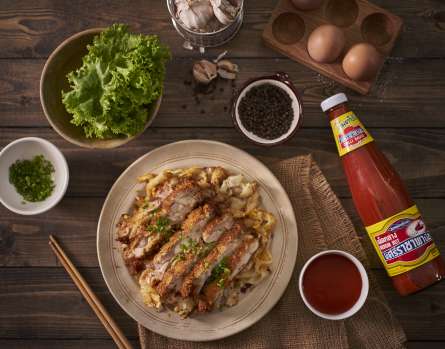 - จัดผักกาดหอมลงในภาชนะ แล้วตักก๋วยเตี๋ยวที่คั่วไว้ลงไป ตามด้วยไก่ทอดกรอบ เสิร์ฟพร้อมกับซอสพริกศรีราชาพานิช