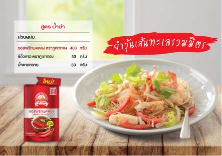 สูตรน้ำยำ ดาวน์โหลดสูตร วัตถุดิบและส่วนผสม 1. ซอสพริกบดดอง ตราภูเขาทอง 400 กรัม 2. ซีอิ๊วขาว ตราภูเขาทอง 30 กรัม 3. น้ำตาลทราย 30 กรัม